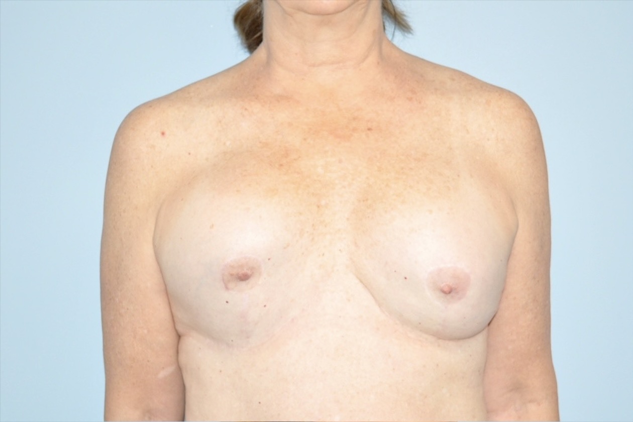 61 year old White woman had a breast augmentation 21 years ago followed by four breast revision surgeries all done elsewhere for capsular contracture. She had another recurrence of capsular contracture especially on the right side with breast deformity and asymmetry. She underwent a removal & replacement of her silicone breast implants with 355cc Mentor BOOST moderate high profile implants in addition to total capsulectomy and allograft placement for an internal bra support. She is now 6 months post surgery with a more natural shape to her breasts.