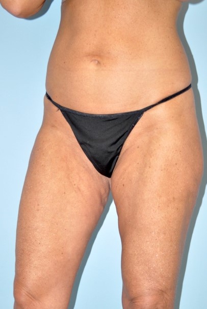 49 year-old White woman with excess loose skin to her inner thighs underwent a medial thigh lift and is shown with a much improved contour and smoother skin six weeks later. Her incisions are nicely hidden in the groin under the underwear.